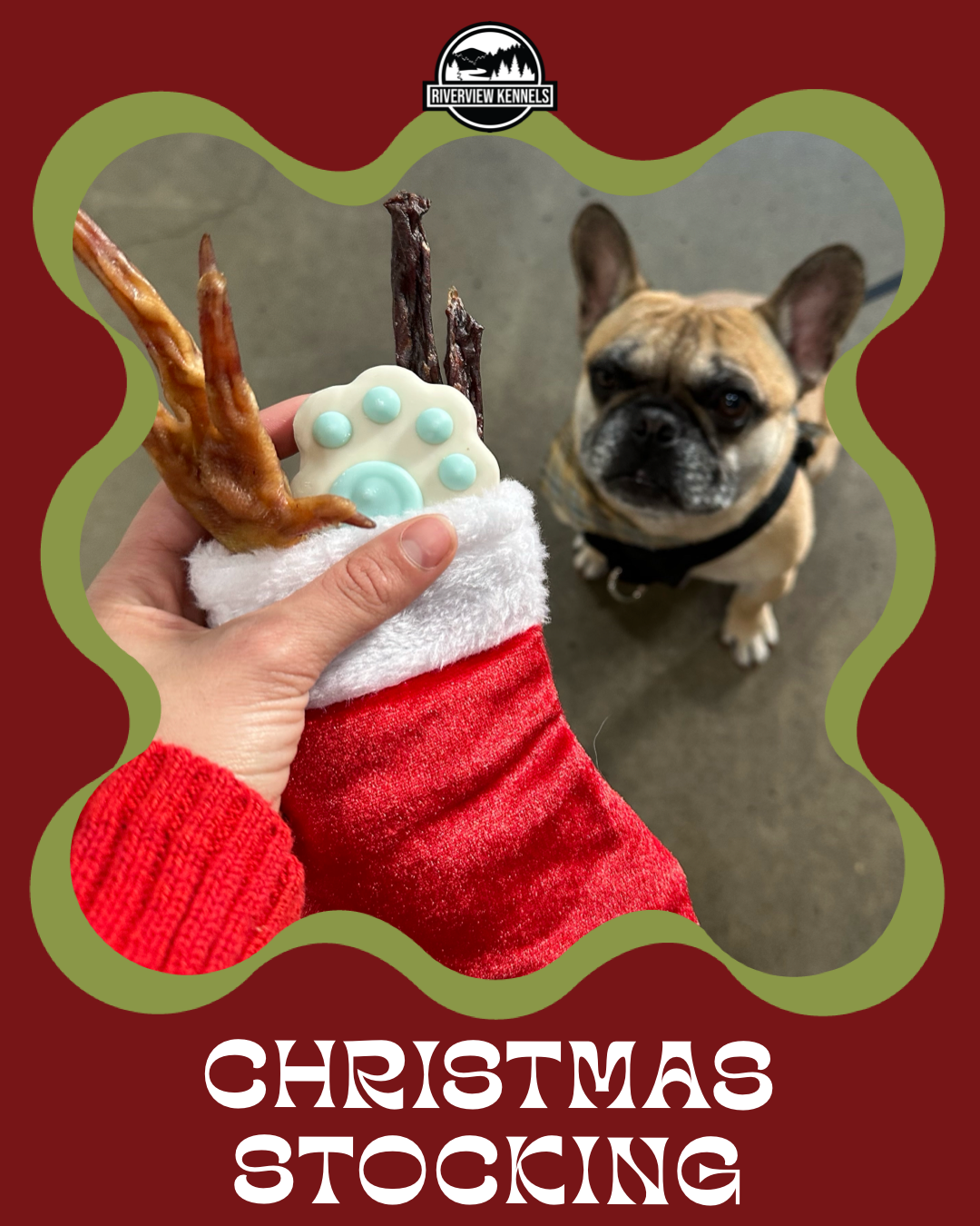 The Christmas Stocking is something special Santa has put together for the special canines staying with us during Christmas. Each stocking contains a collection of tasty treats and fun toys, including a small Christmas cookie, two delicious gizzard chews, a yummy dehydrated chicken head, and a special toy.